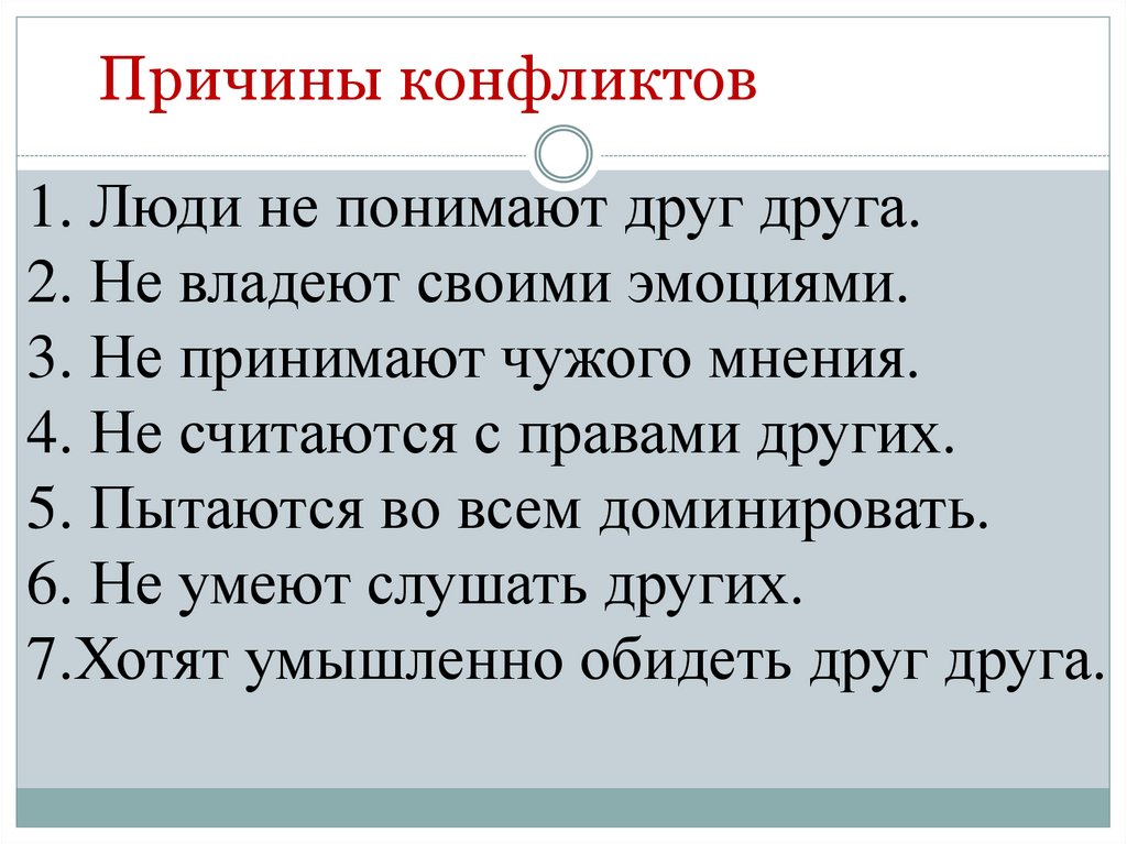 Причины конфликтов1. Люди не понимают друг друга.
