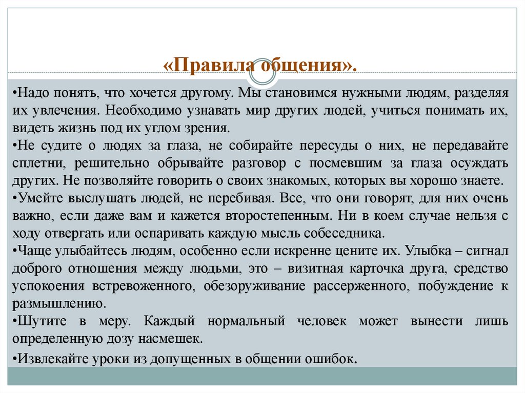 «Правила общения».•Надо понять, что хочется другому. Мы становимся нужными людям, разделяя