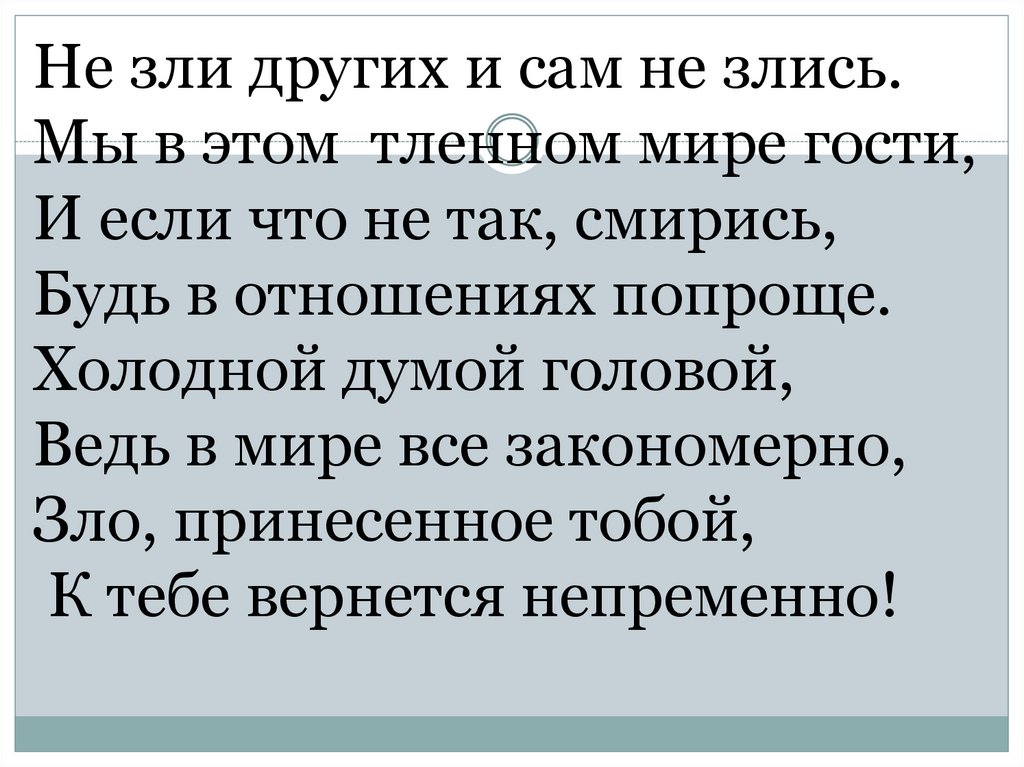 Не зли других и сам не злись.Мы в этом тленном мире гости,