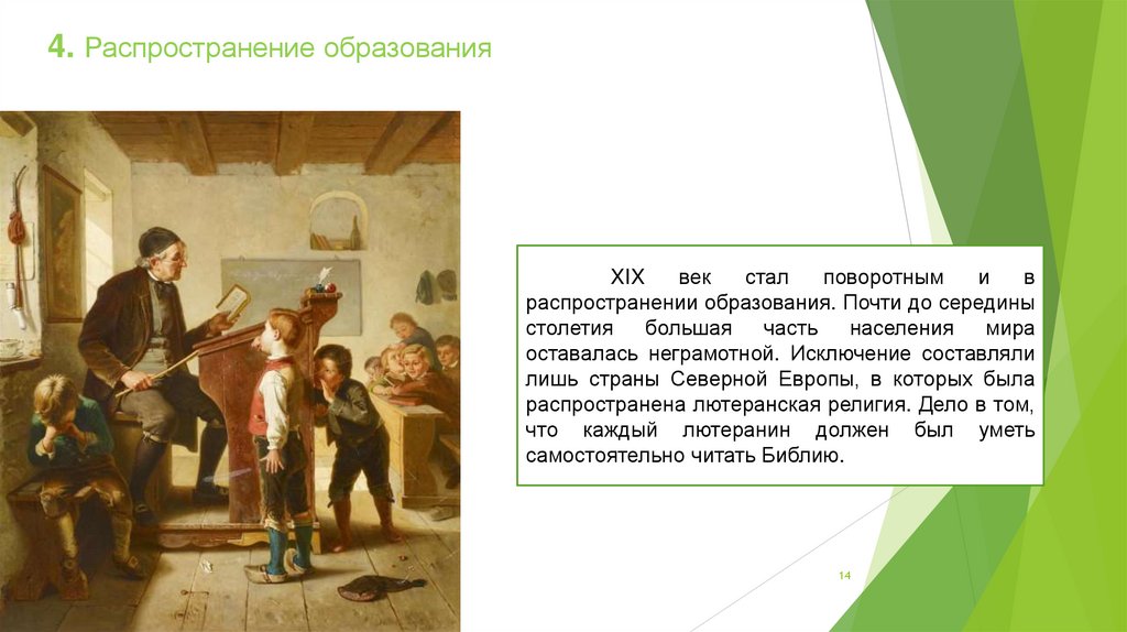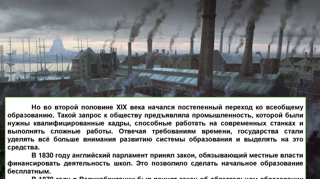 Но во второй половине XIX века начался постепенный переход ко всеобщемуобразованию. Такой запрос к обществу предъявляла промышленность, которой были