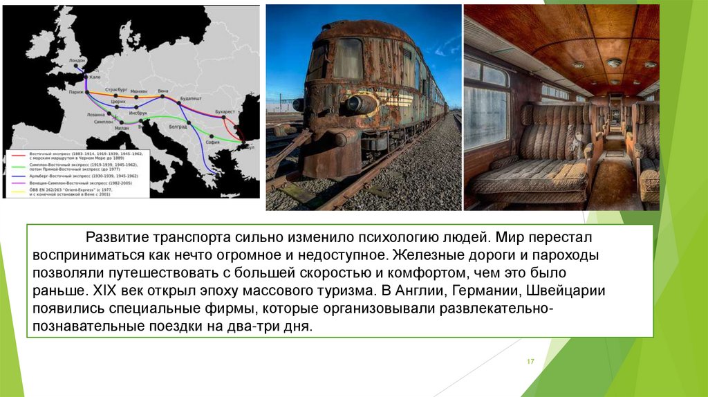 Развитие транспорта сильно изменило психологию людей. Мир пересталвосприниматься как нечто огромное и недоступное. Железные дороги и пароходы