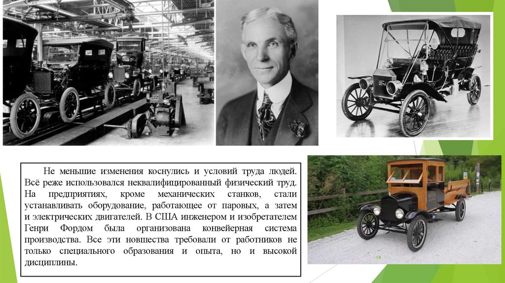 Не меньшие изменения коснулись и условий труда людей.Всё реже использовался неквалифицированный физический труд.