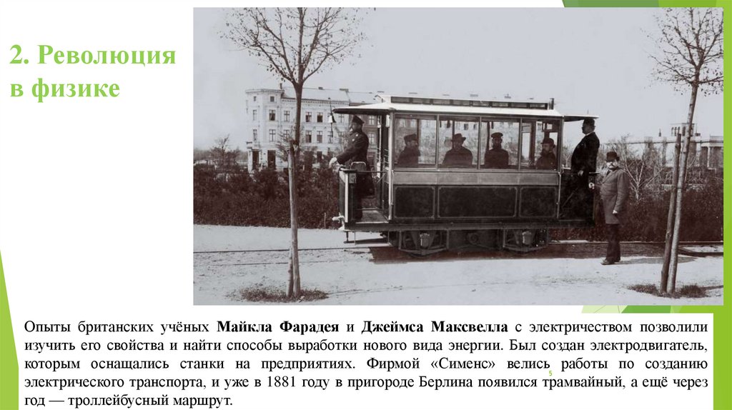 электрического транспорта, и уже в 1881 году в пригороде Берлина появился трамвайный, а ещё через