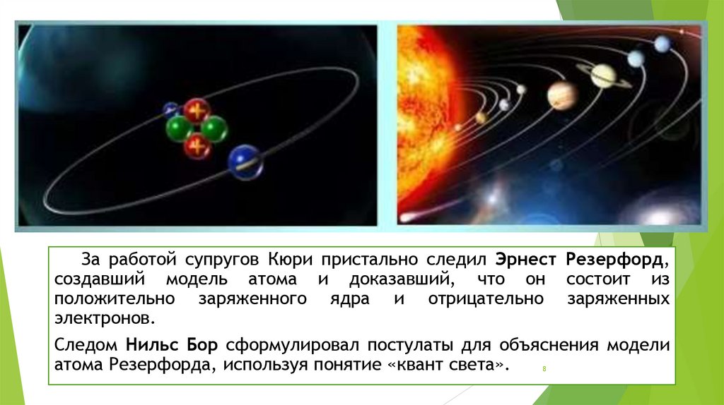 За работой супругов Кюри пристально следил Эрнест Резерфорд,создавший модель атома и доказавший, что он состоит из