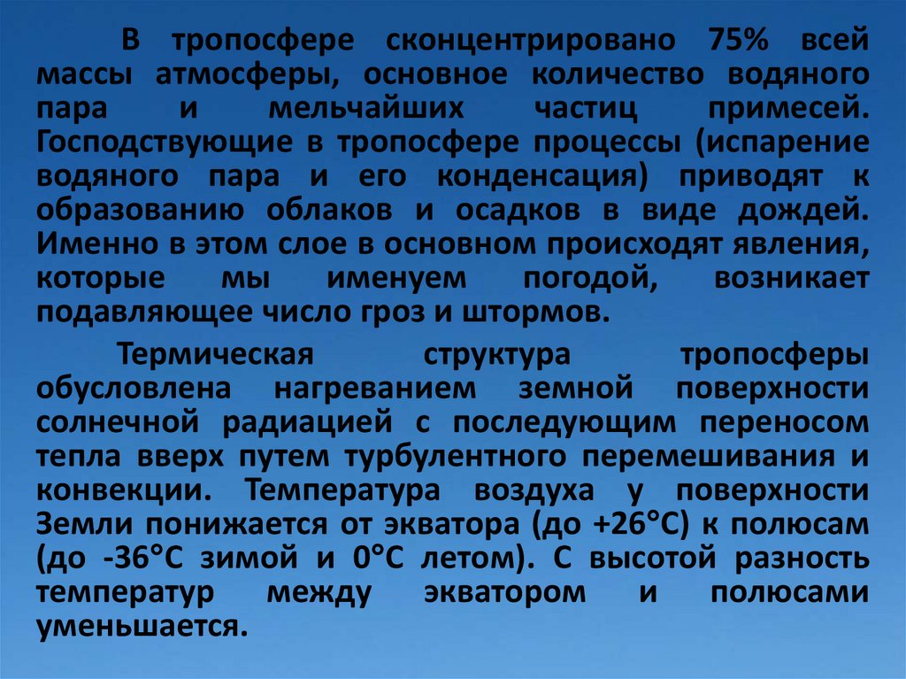 В тропосфере сконцентрировано 75% всеймассы атмосферы, основное количество водяного