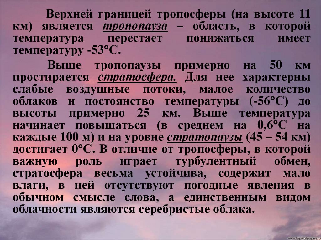 Верхней границей тропосферы (на высоте 11км) является тропопауза – область, в которой