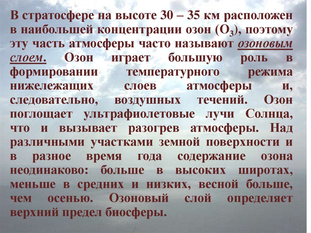 В стратосфере на высоте 30 – 35 км расположенв наибольшей концентрации озон (О3), поэтому