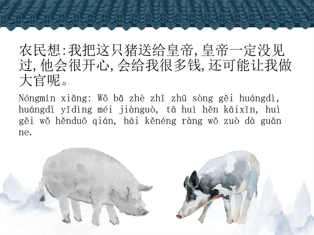 农民想:我把这只猪送给皇帝,皇帝一定没见过,他会很开心,会给我很多钱,还可能让我做