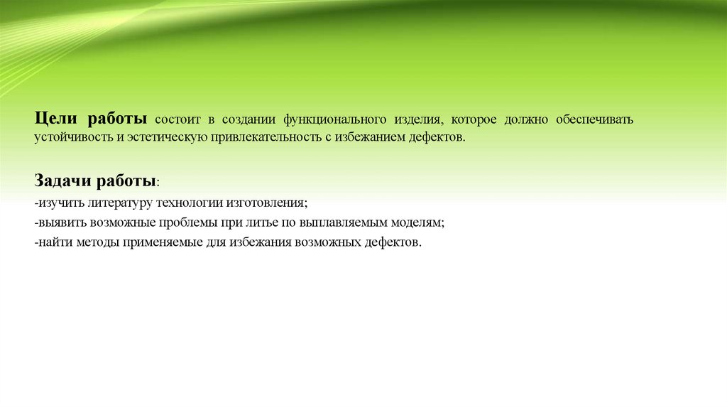 Цели работы состоит в создании функционального изделия, которое должно обеспечиватьустойчивость и эстетическую привлекательность с избежанием дефектов.