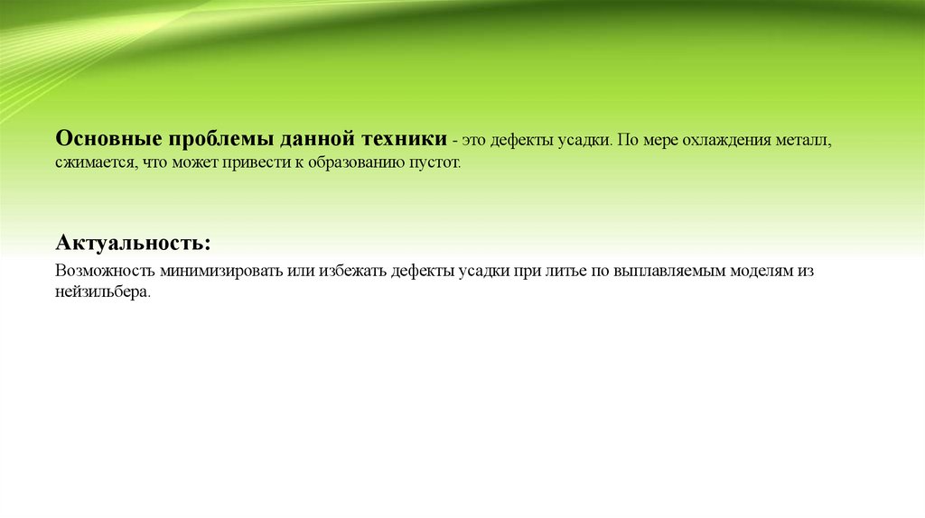 Основные проблемы данной техники - это дефекты усадки. По мере охлаждения металл,сжимается, что может привести к образованию пустот.