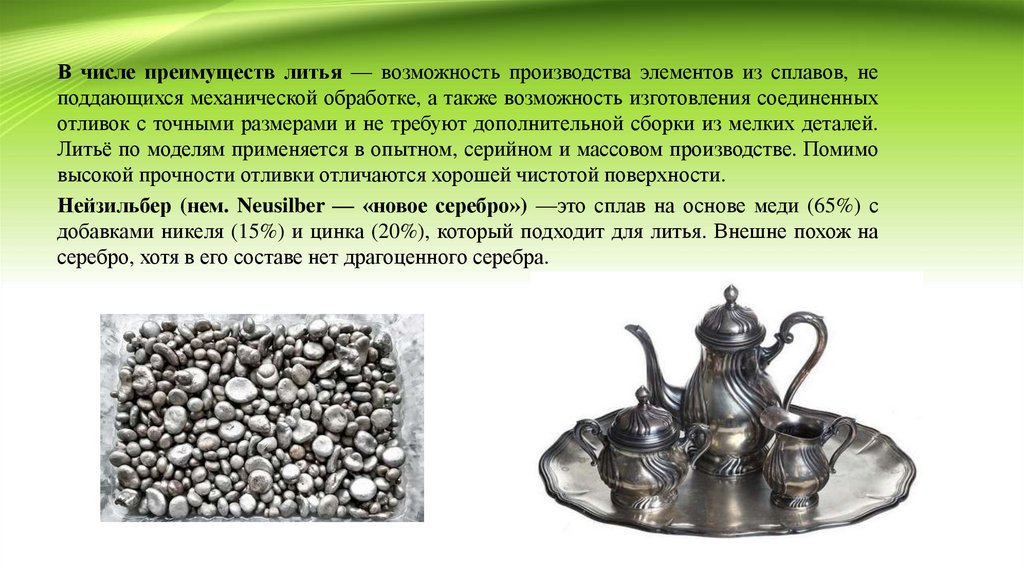 добавками никеля (15%) и цинка (20%), который подходит для литья. Внешне похож на