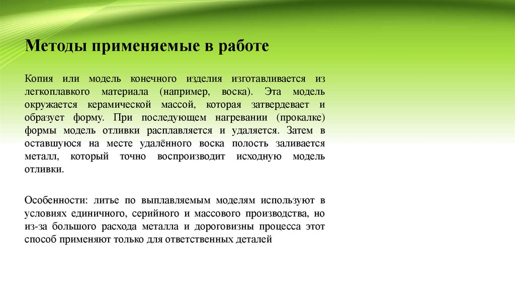 Методы применяемые в работеКопия или модель конечного изделия изготавливается из