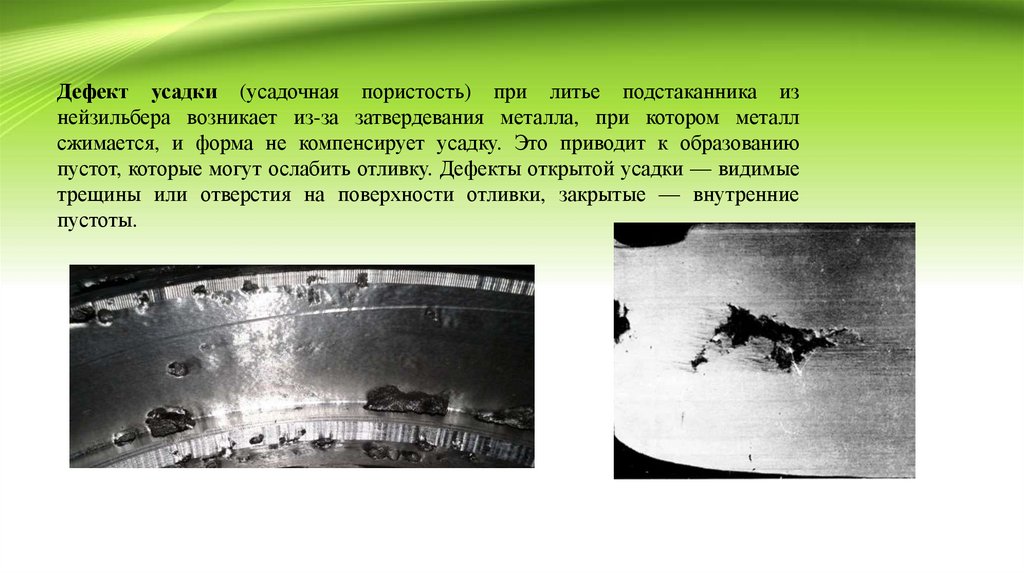 Дефект усадки (усадочная пористость) при литье подстаканника изнейзильбера возникает из-за затвердевания металла, при котором металл