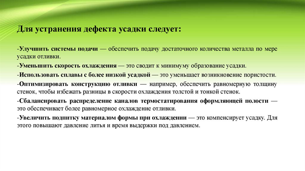 Для устранения дефекта усадки следует:-Улучшить системы подачи — обеспечить подачу достаточного количества металла по мере