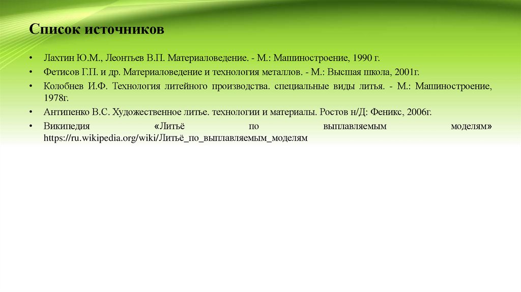 Список источниковЛахтин Ю.М., Леонтьев В.П. Материаловедение. - М.: Машиностроение, 1990 г.