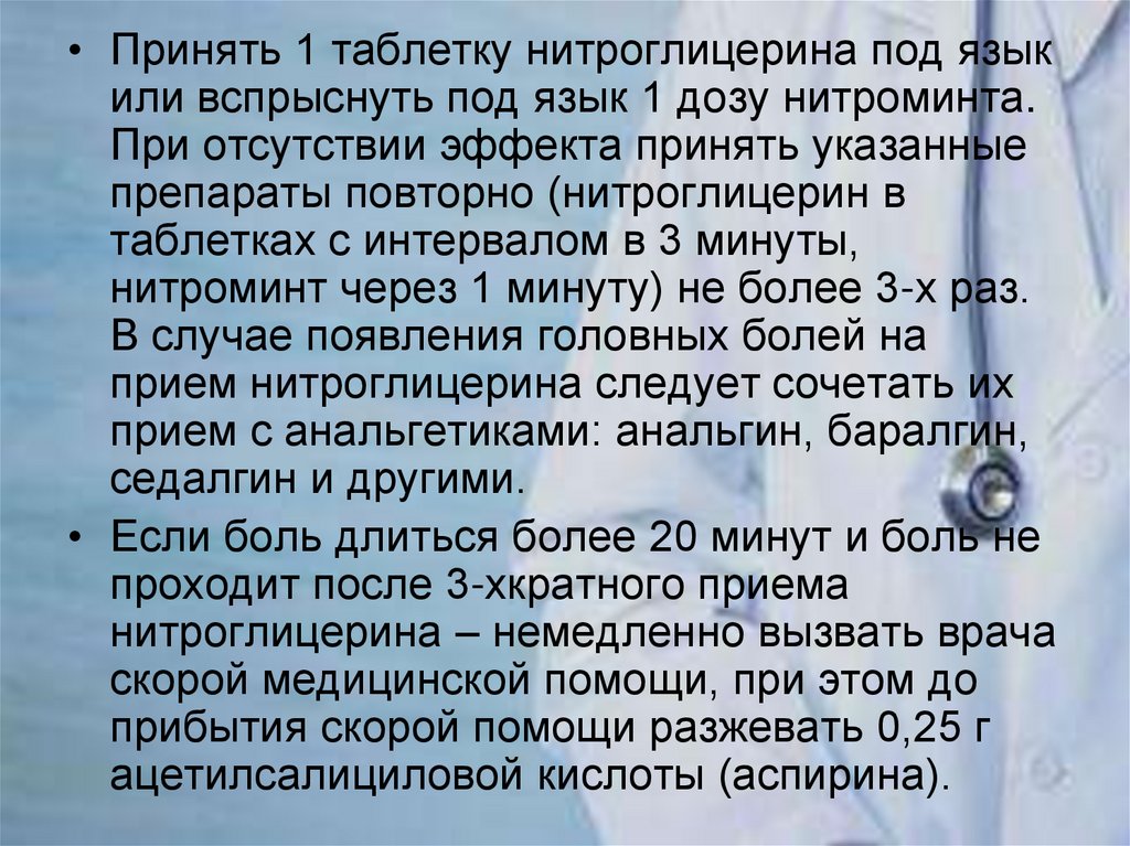 • Принять 1 таблетку нитроглицерина под языкили вспрыснуть под язык 1 дозу нитроминта.