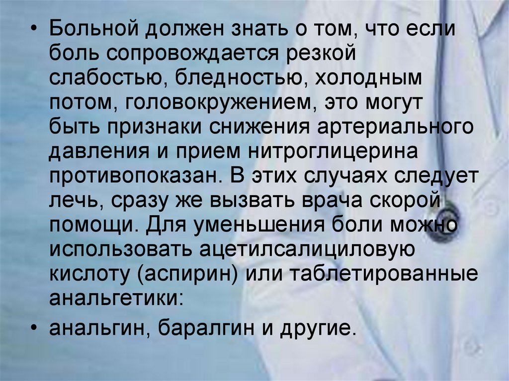 • Больной должен знать о том, что еслиболь сопровождается резкой