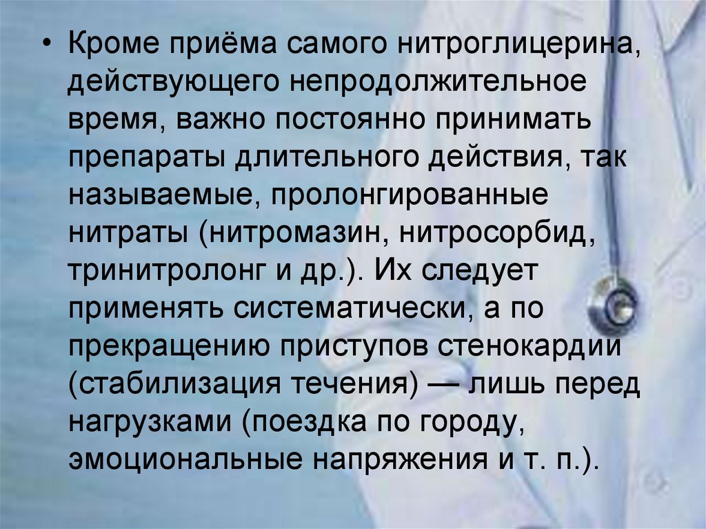 • Кроме приёма самого нитроглицерина,действующего непродолжительное