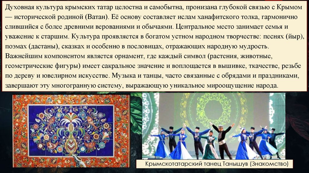 Духовная культура крымских татар целостна и самобытна, пронизана глубокой связью с Крымом— исторической родиной (Ватан). Её основу составляет ислам ханафитского толка, гармонично