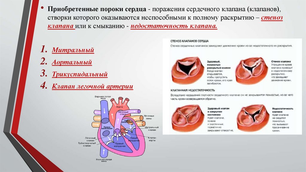 • Приобретенные пороки сердца - поражения сердечного клапана (клапанов),створки которого оказываются неспособными к полному раскрытию – стеноз