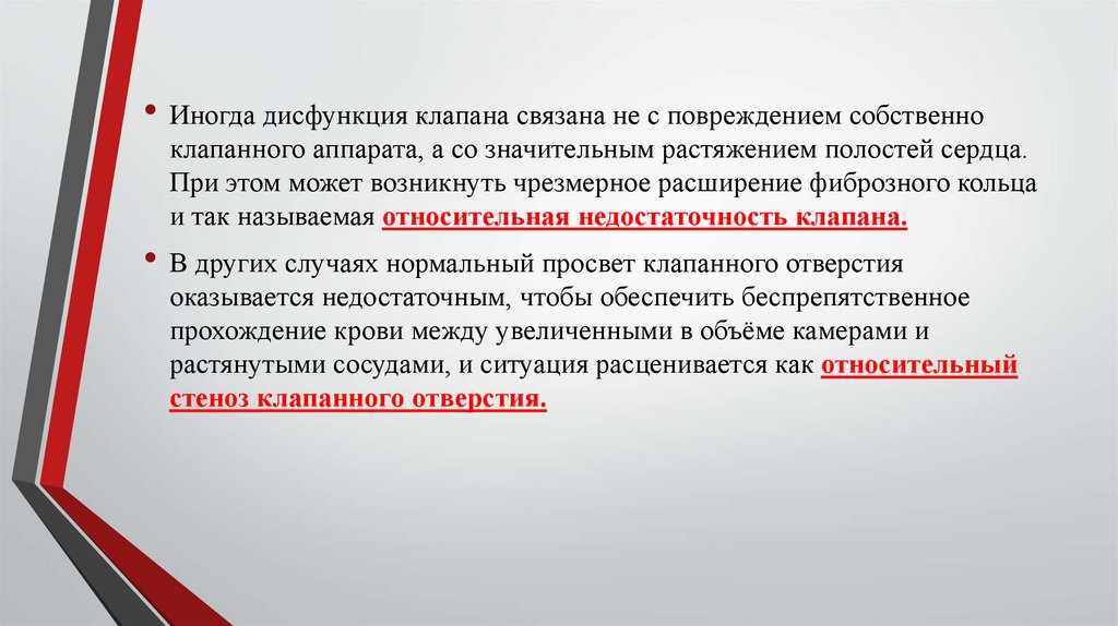 • Иногда дисфункция клапана связана не с повреждением собственноклапанного аппарата, а со значительным растяжением полостей сердца.