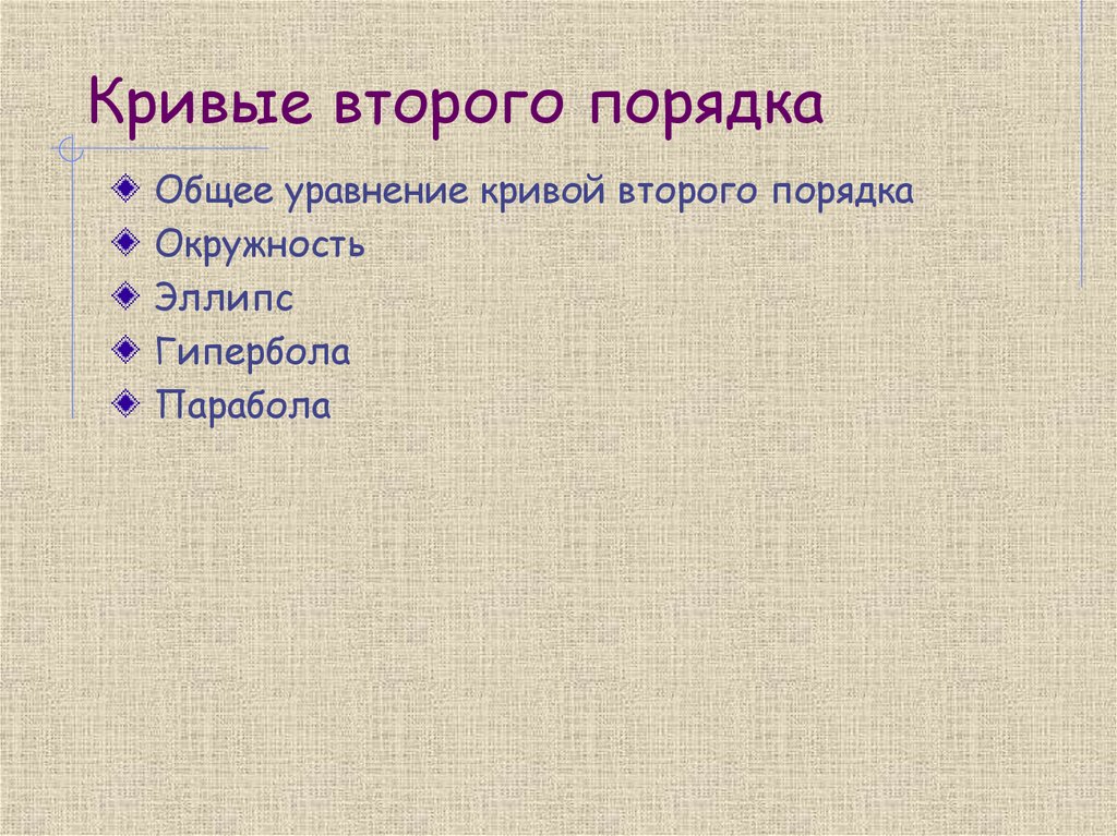 К кривым второго порядка относятся: эллипс, частным случаемкоторого является окружность, гипербола и парабола.