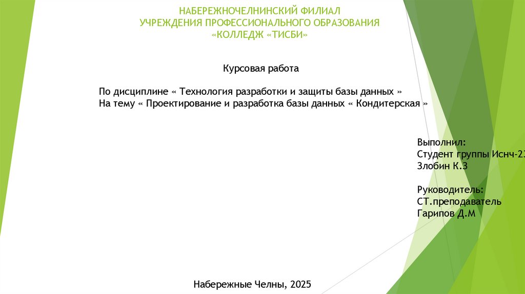 На тему « Проектирование и разработка базы данных « Кондитерская »