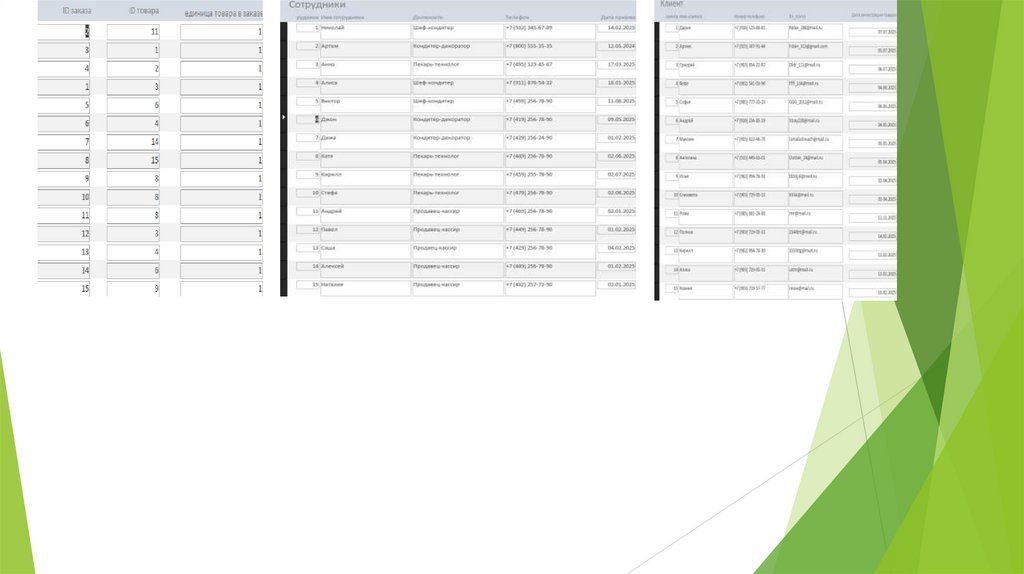 Сотрудники: Информация о сотрудниках(Имя,телефон,почта)