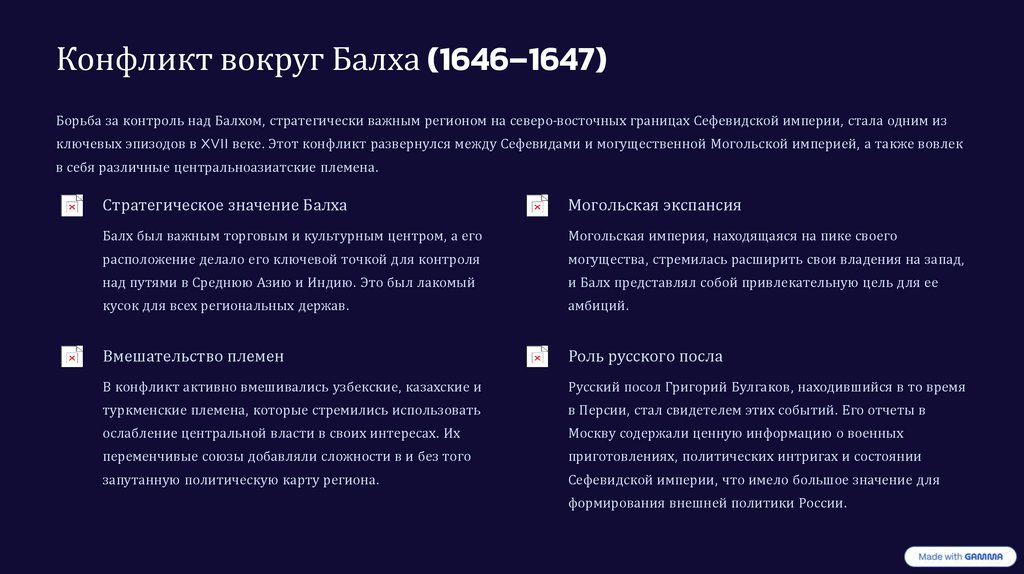 Конфликт вокруг Балха (1646–1647)Борьба за контроль над Балхом, стратегически важным регионом на северо-восточных границах Сефевидской империи, стала одним из