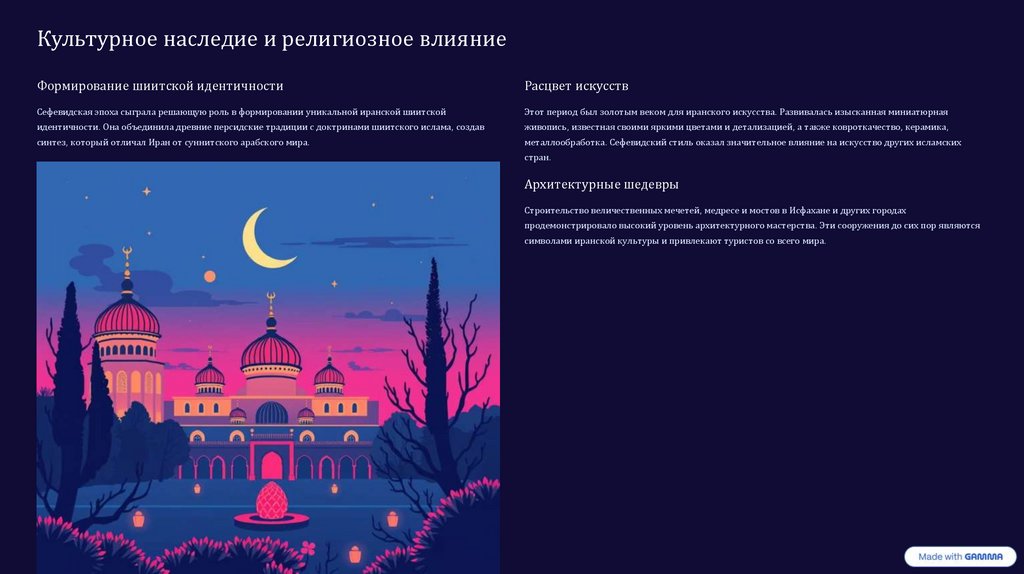 идентичности. Она объединила древние персидские традиции с доктринами шиитского ислама, создав