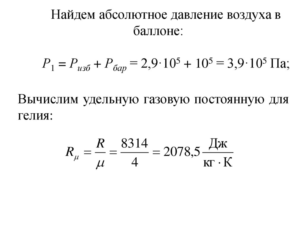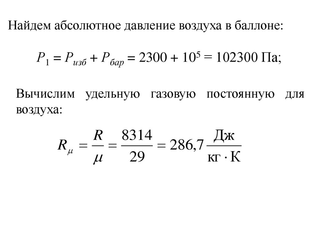 Найдем абсолютное давление воздуха в баллоне:Р1 = Ризб + Рбар = 2300 + 105 = 102300 Па;