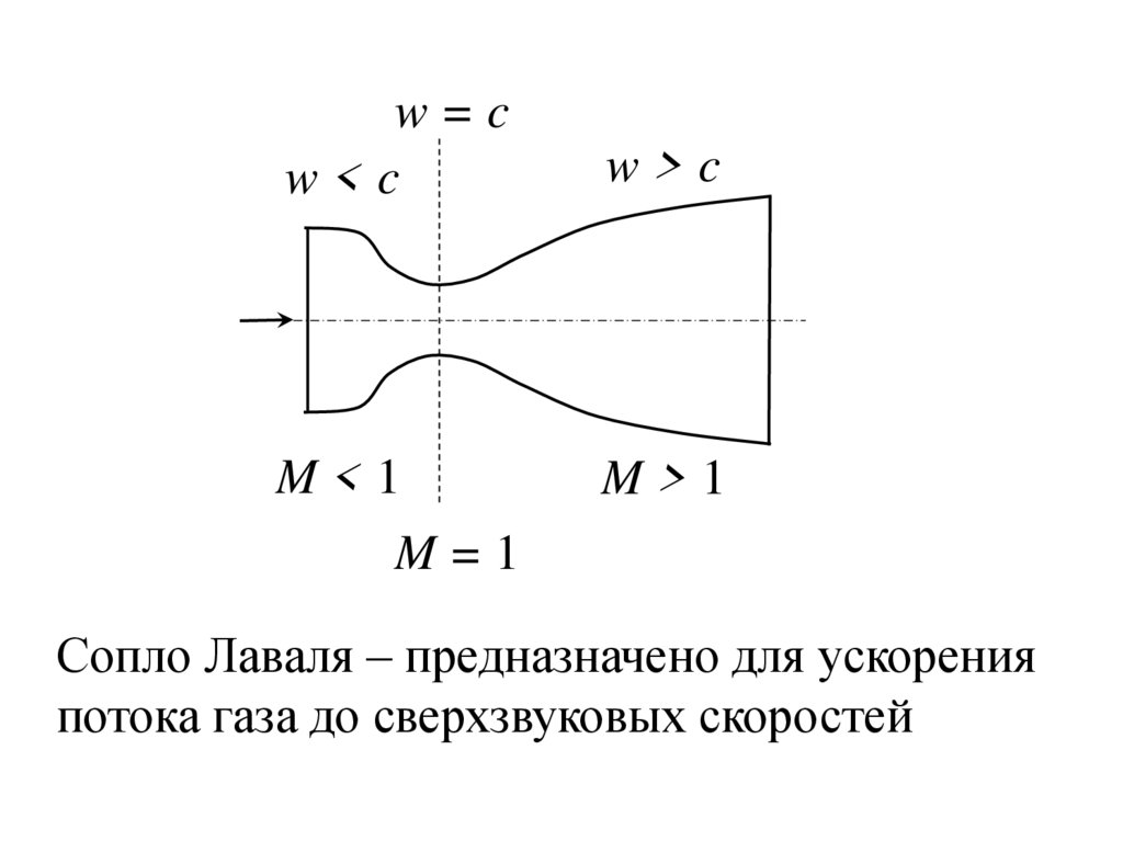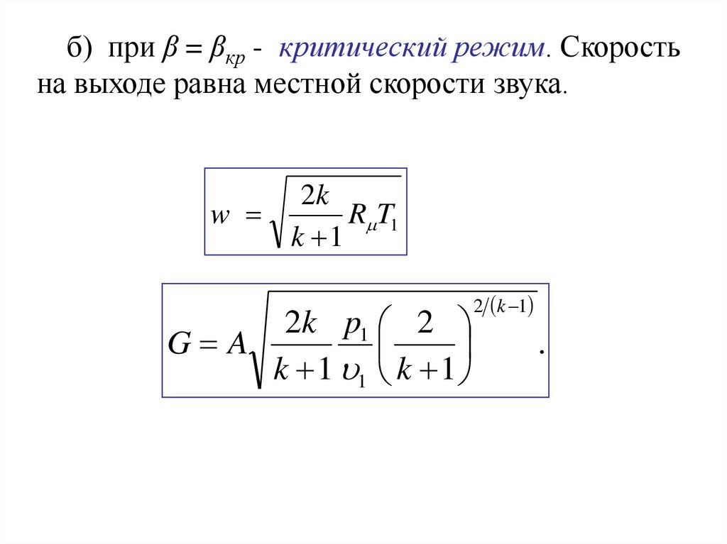 б) при β = βкр - критический режим. Скоростьна выходе равна местной скорости звука.