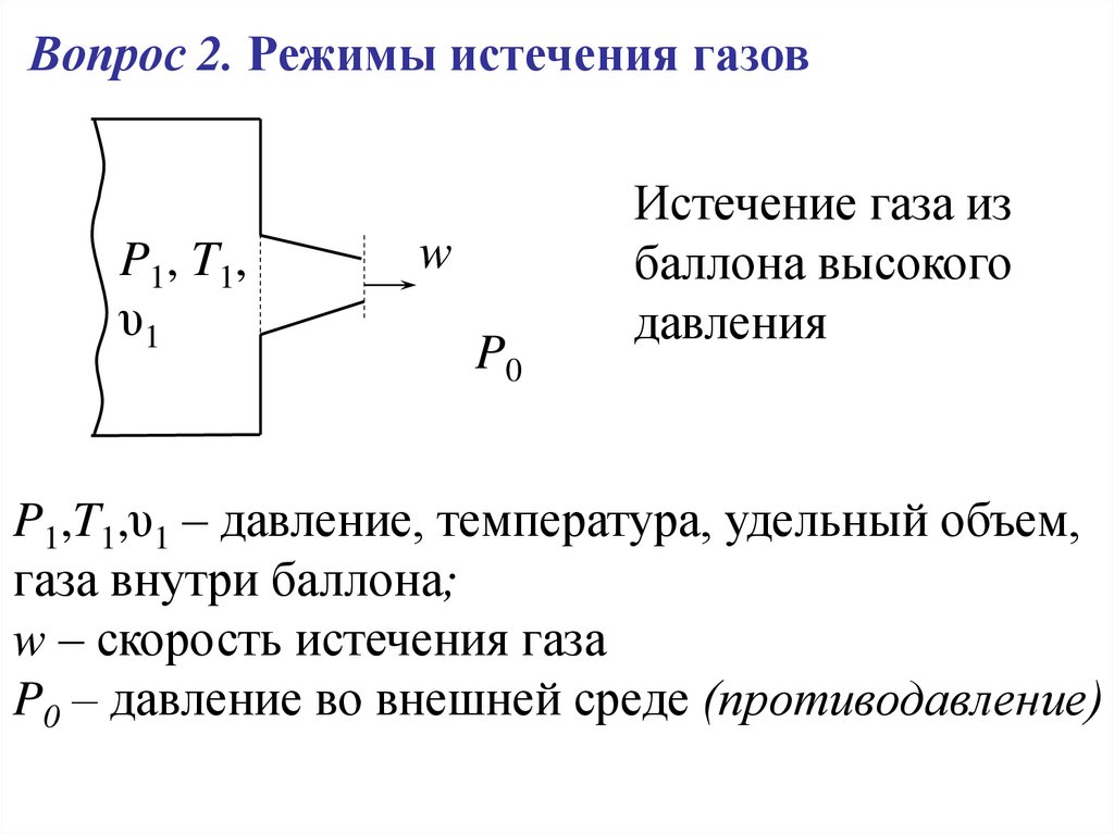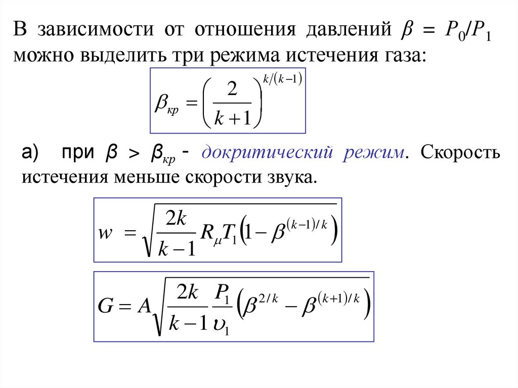 В зависимости от отношения давлений β = Р0/Р1можно выделить три режима истечения газа: