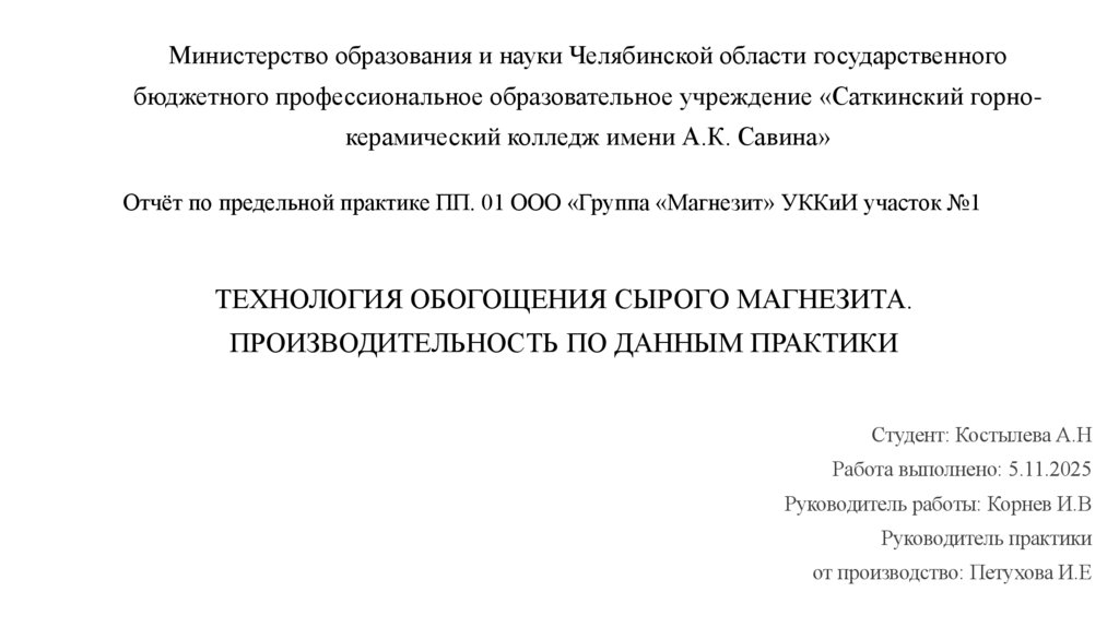 «Саткинский горнокерамический колледж имени А.К. Савина»Отчёт по предельной практике ПП. 01 ООО «Группа «Магнезит» УККиИ участок №1