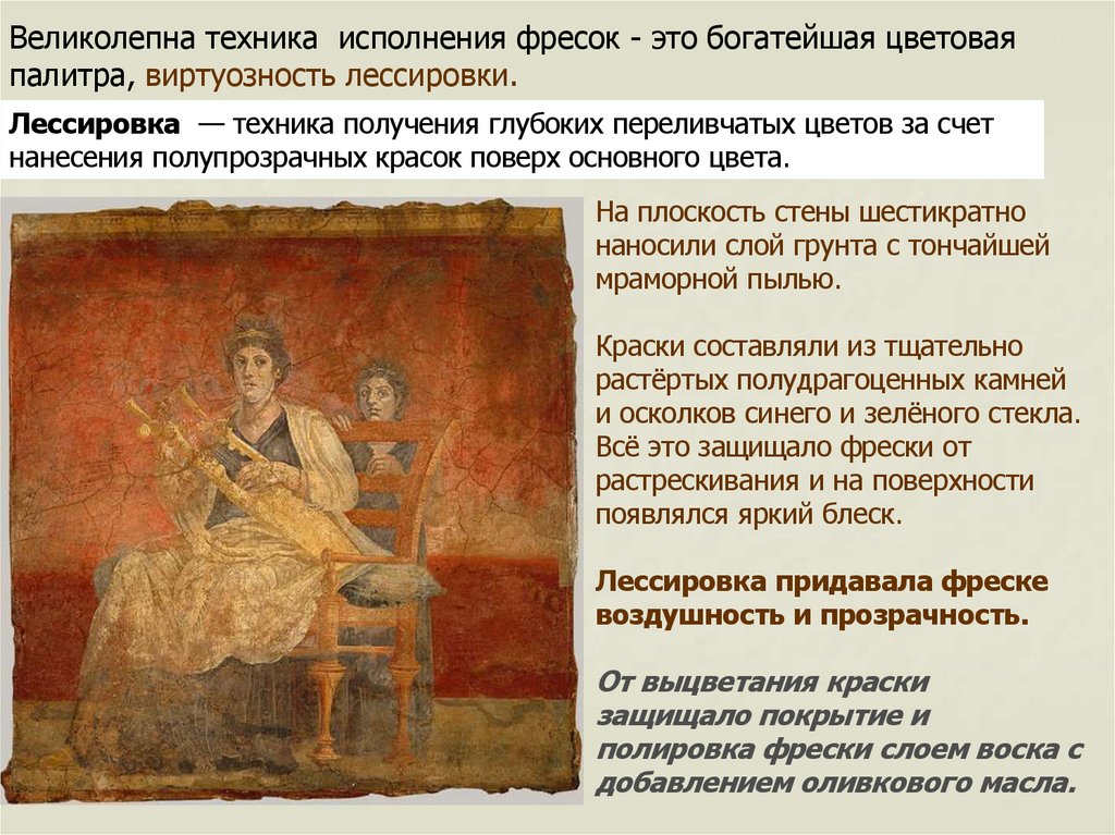 Великолепна техника исполнения фресок - это богатейшая цветоваяпалитра, виртуозность лессировки.