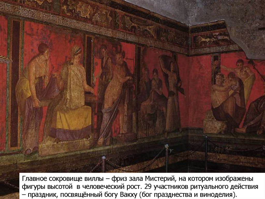 Главное сокровище виллы – фриз зала Мистерий, на котором изображеныфигуры высотой в человеческий рост. 29 участников ритуального действия