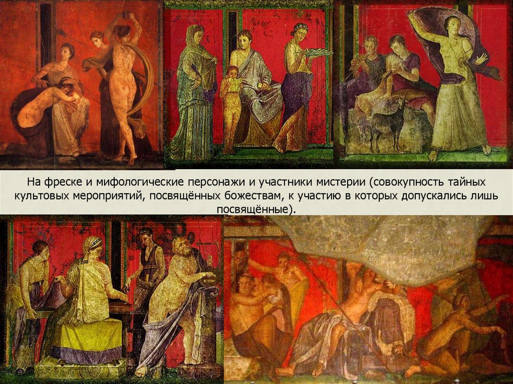 На фреске и мифологические персонажи и участники мистерии (совокупность тайныхкультовых мероприятий, посвящённых божествам, к участию в которых допускались лишь
