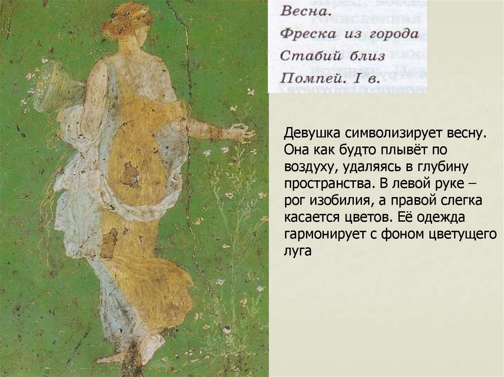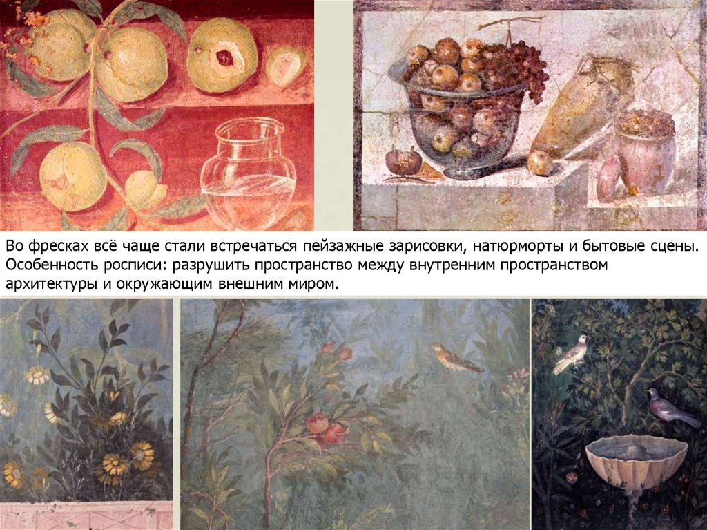 Во фресках всё чаще стали встречаться пейзажные зарисовки, натюрморты и бытовые сцены.Особенность росписи: разрушить пространство между внутренним пространством