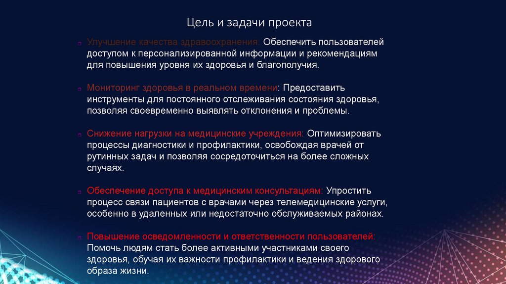 Цель и задачи проектаУлучшение качества здравоохранения: Обеспечить пользователей