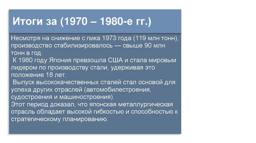 Итоги за (1970 – 1980-е гг.)Несмотря на снижение с пика 1973 года (119 млн тонн),