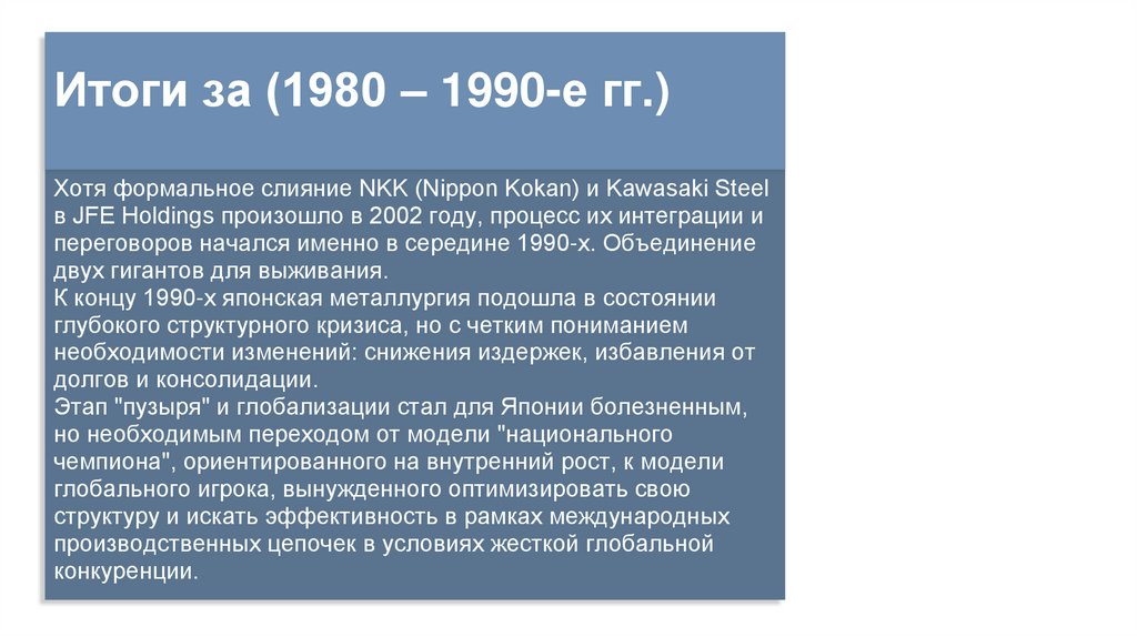 Итоги за (1980 – 1990-е гг.)Хотя формальное слияние NKK (Nippon Kokan) и Kawasaki Steel