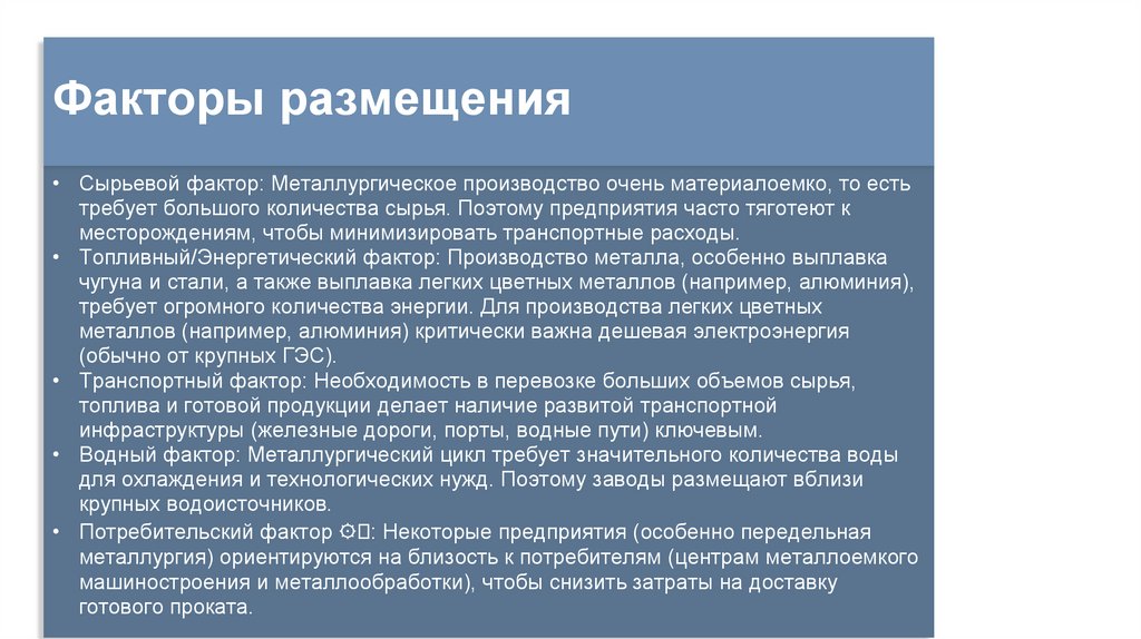 Факторы размещения• Сырьевой фактор: Металлургическое производство очень материалоемко, то есть