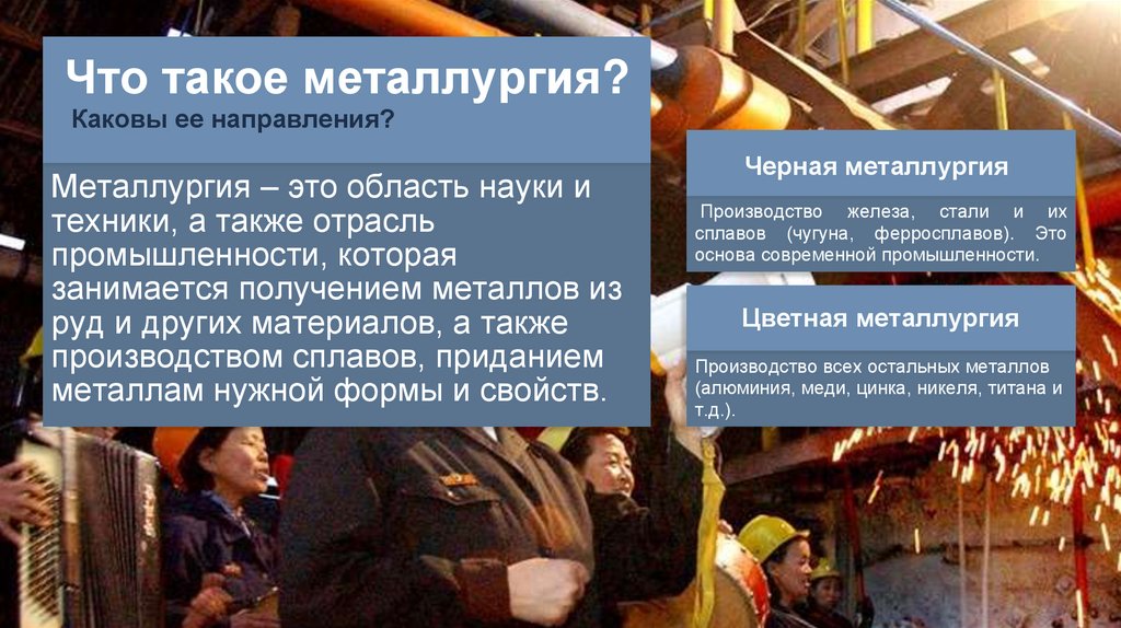 чугуна и стали, а также выплавка легких цветных металлов (например, алюминия),