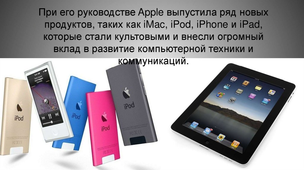 При его руководстве Apple выпустила ряд новыхпродуктов, таких как iMac, iPod, iPhone и iPad,