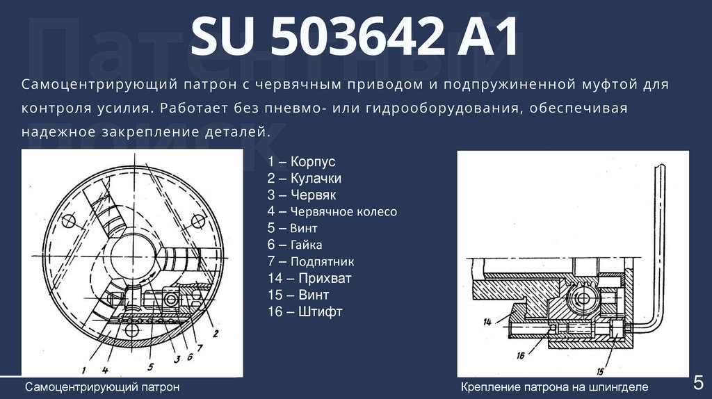 SU 503642 A1Самоцентрирующий патрон с червячным приводом и подпружиненной муфтой для