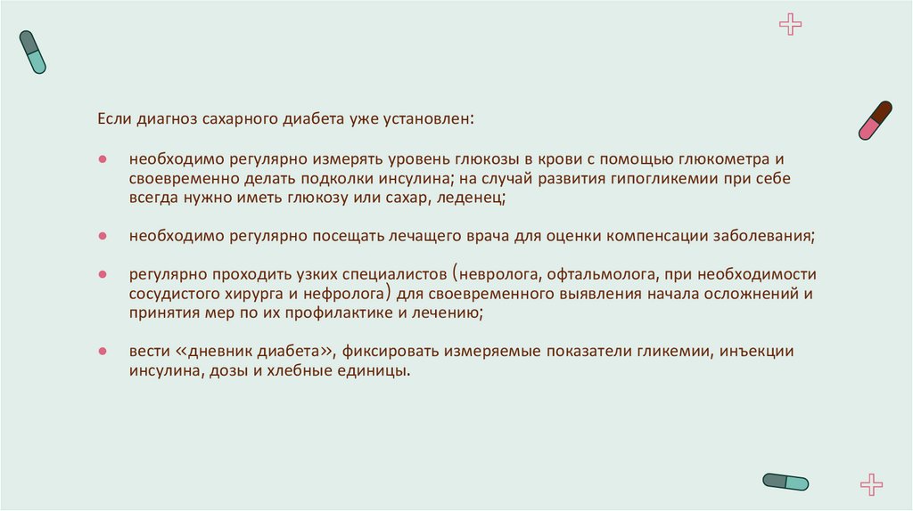необходимо регулярно посещать лечащего врача для оценки компенсации заболевания;