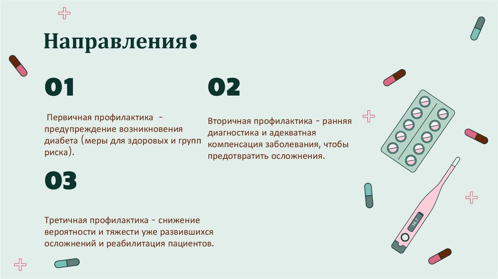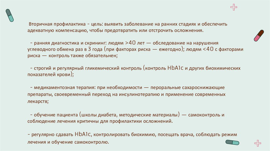 Вторичная профилактика - цель: выявить заболевание на ранних стадиях и обеспечитьадекватную компенсацию, чтобы предотвратить или отстрочить осложнения.