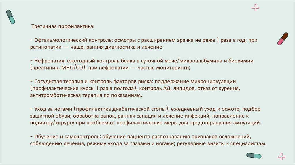 соблюдению лечения, режиму ухода за глазами и ногами; регулярные визиты к специалистам.