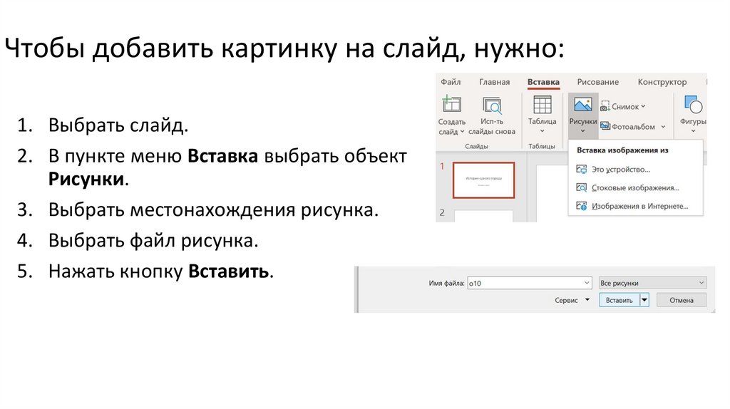 Чтобы добавить картинку на слайд, нужно:1. Выбрать слайд.