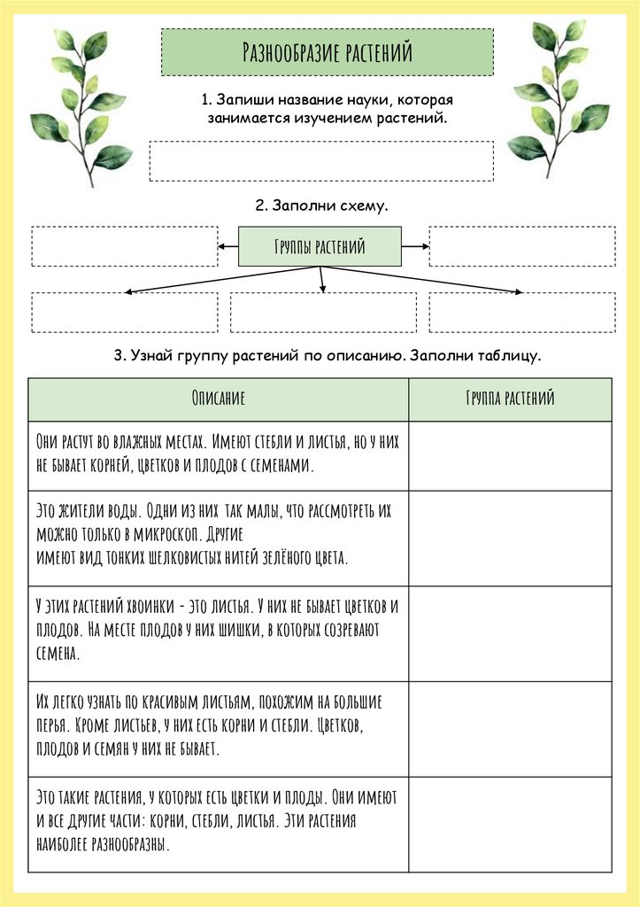 3. Узнай группу растений по описанию. Заполни таблицу.